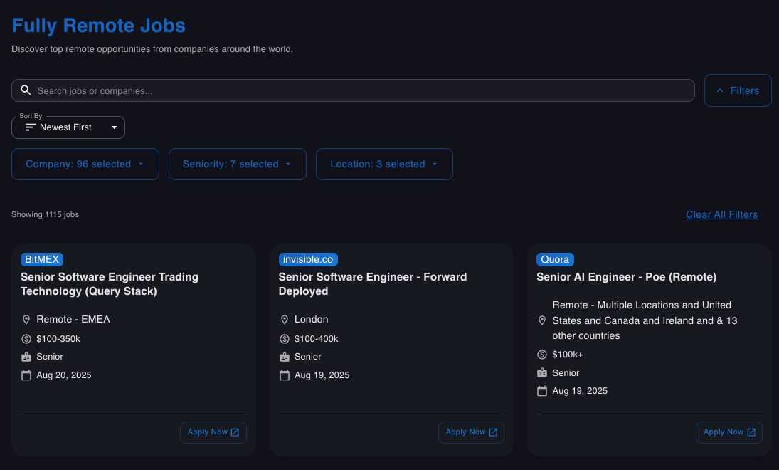 Hundreds of jobs from 100+ fully-remote companies paying $100-600k per year.