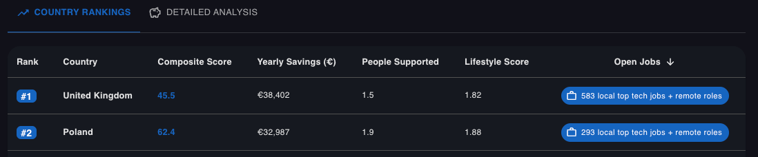 Ranking countries by number of jobs on EuroTopTechJobs.com, we see that the UK is first and Poland second: