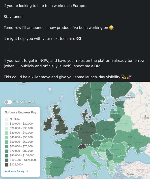 If you want to try out hiring some awesome remote tech talent from my (80k+ people) targeted audience, reply to this email, and for 50 eur I can get you in front of everyone, and have you benefit from all the traffic during the public launch.