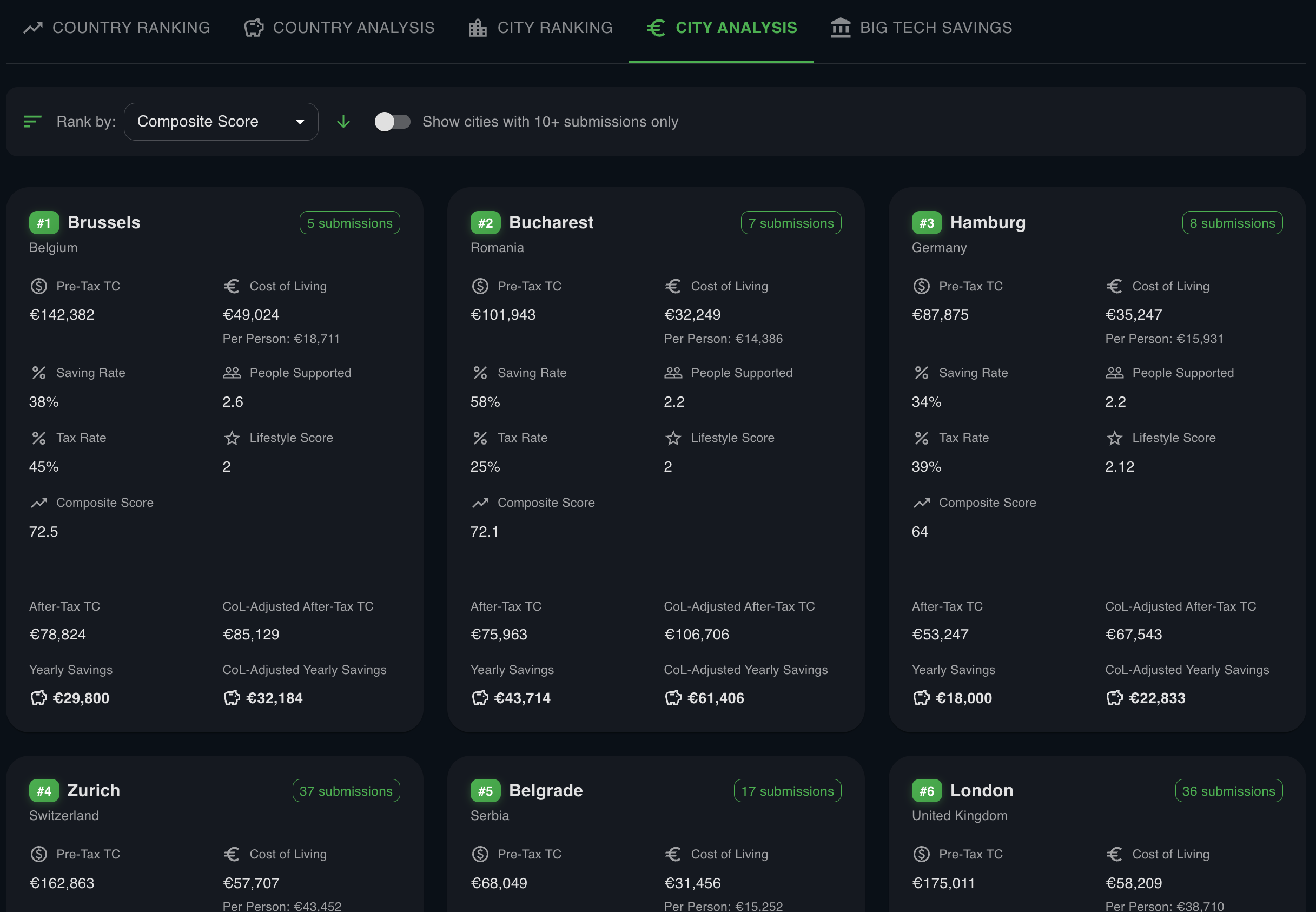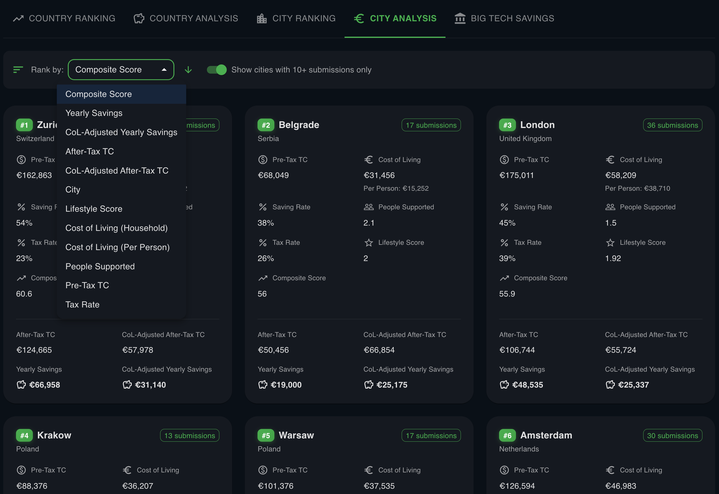 On the “City Analysis” tab, you can see more data and sort cities by single metrics.