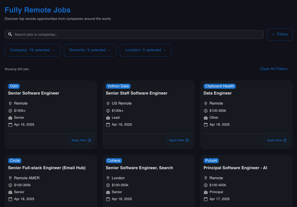 Hundreds of jobs from 100+ fully-remote companies paying $100-600k per year.