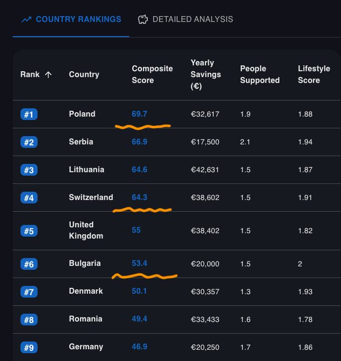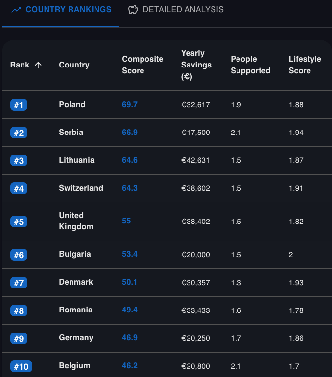 Greatest savings (€43k) thanks to good salaries (often remote) and low taxes and CoL.