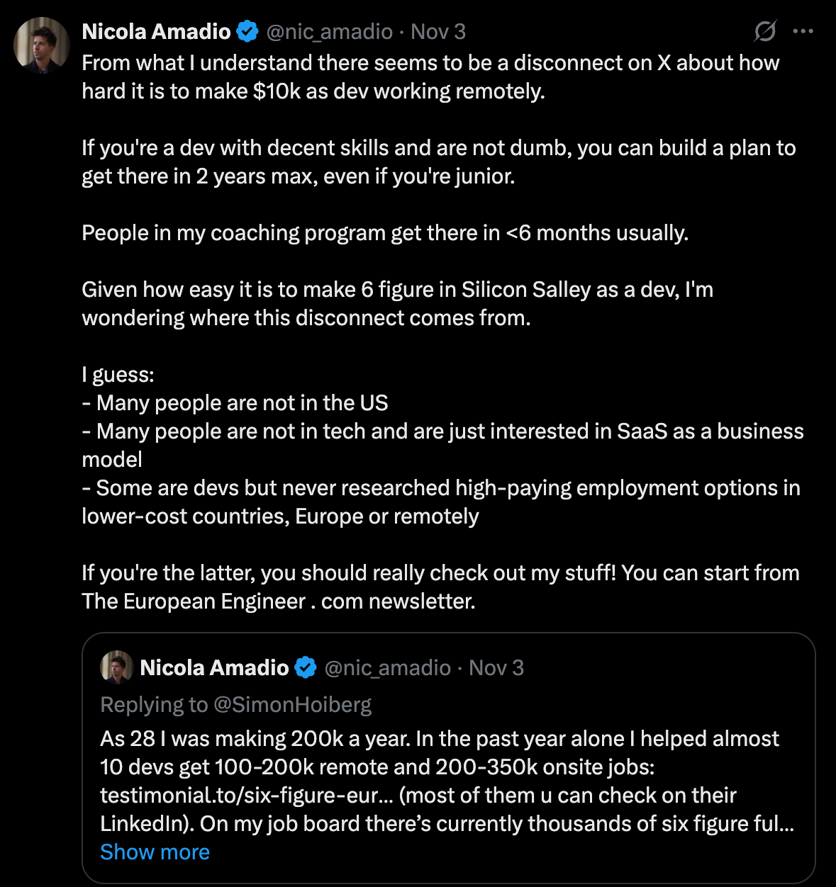 Work 1:1 with me (Nicola Amadio, author of this newsletter), and join the other engineers who were able to 10x their tech career in the past few months!