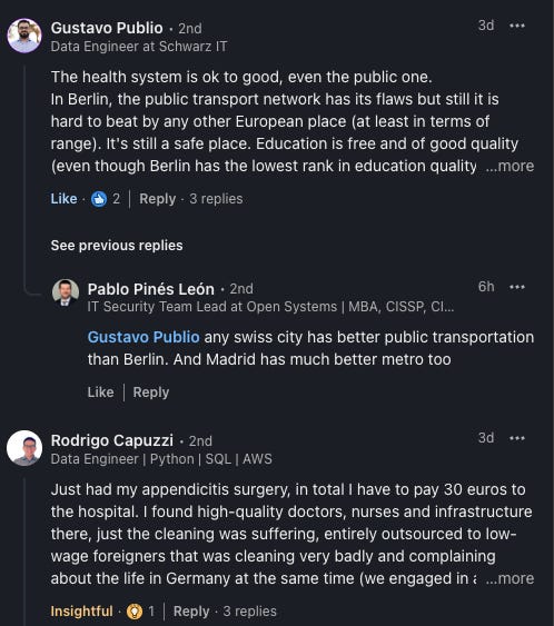 Even this guy, a German dev who moved to Switzerland/Poland (and very happy about his choice), while saying that Germany is ok only to be a classic “middle-class” person, admits that healthcare in Germany is quite good: