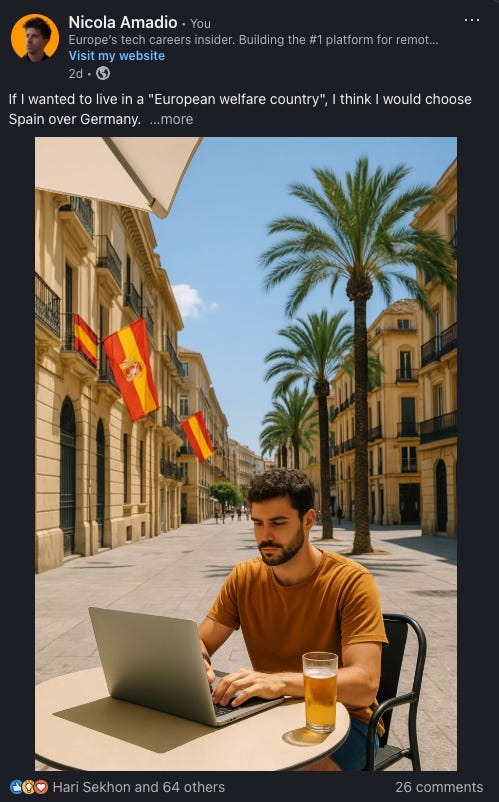 Considering Spain’s recent uptick in top-paying jobs availability, I think I would pick that over the other “Welfare-states”