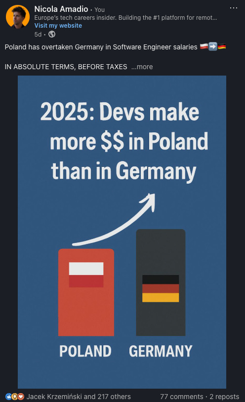Last week, Poland surpassed Germany on Euro Tech Money on total compensation (before taxes, not CoL-adj - i.e. in absolute terms) figures.