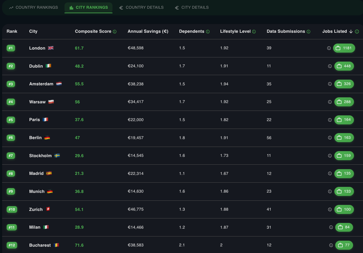Top countries and cities by amount of high-paying onsite/hybrid jobs (from EuroTopTech.com)