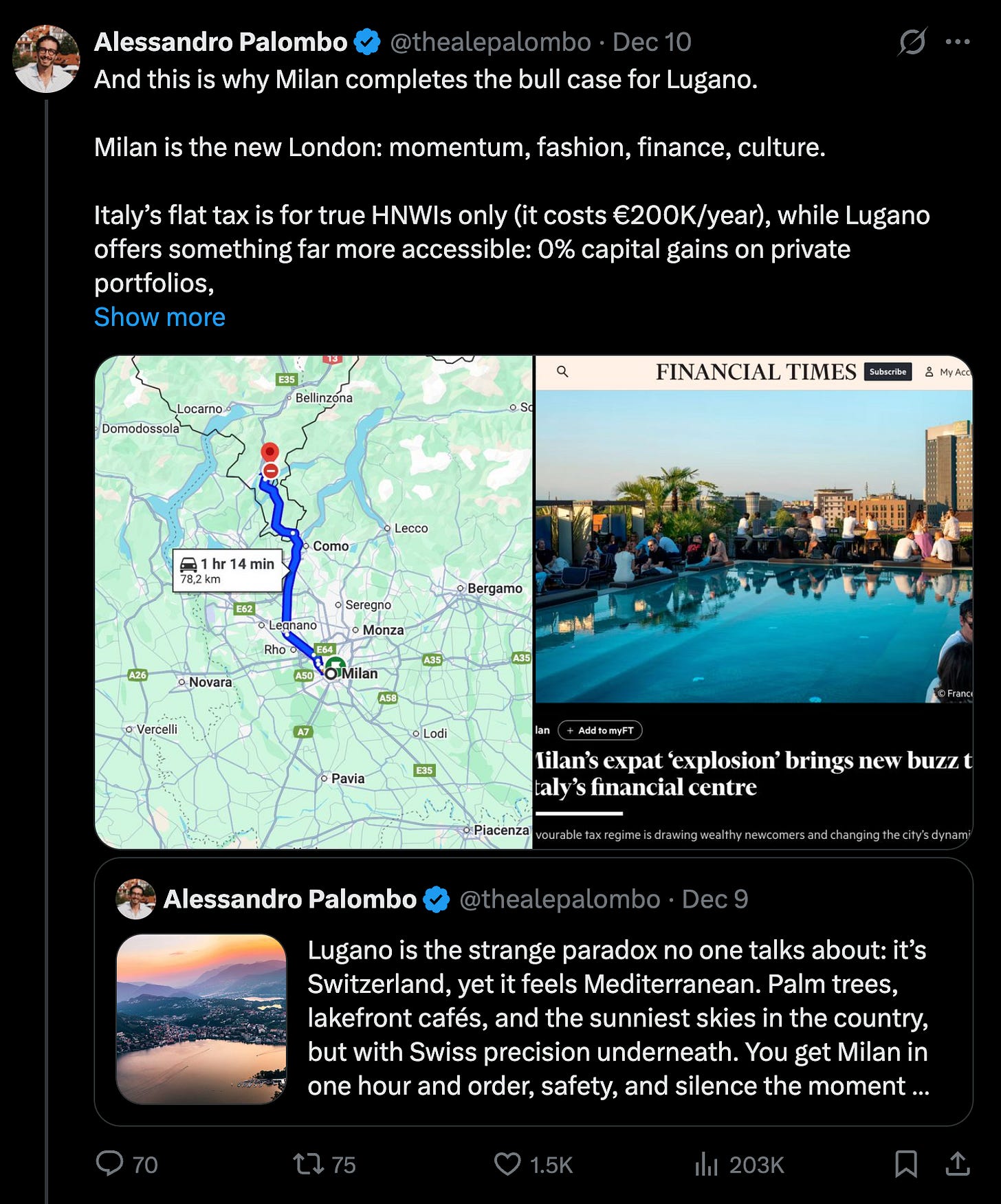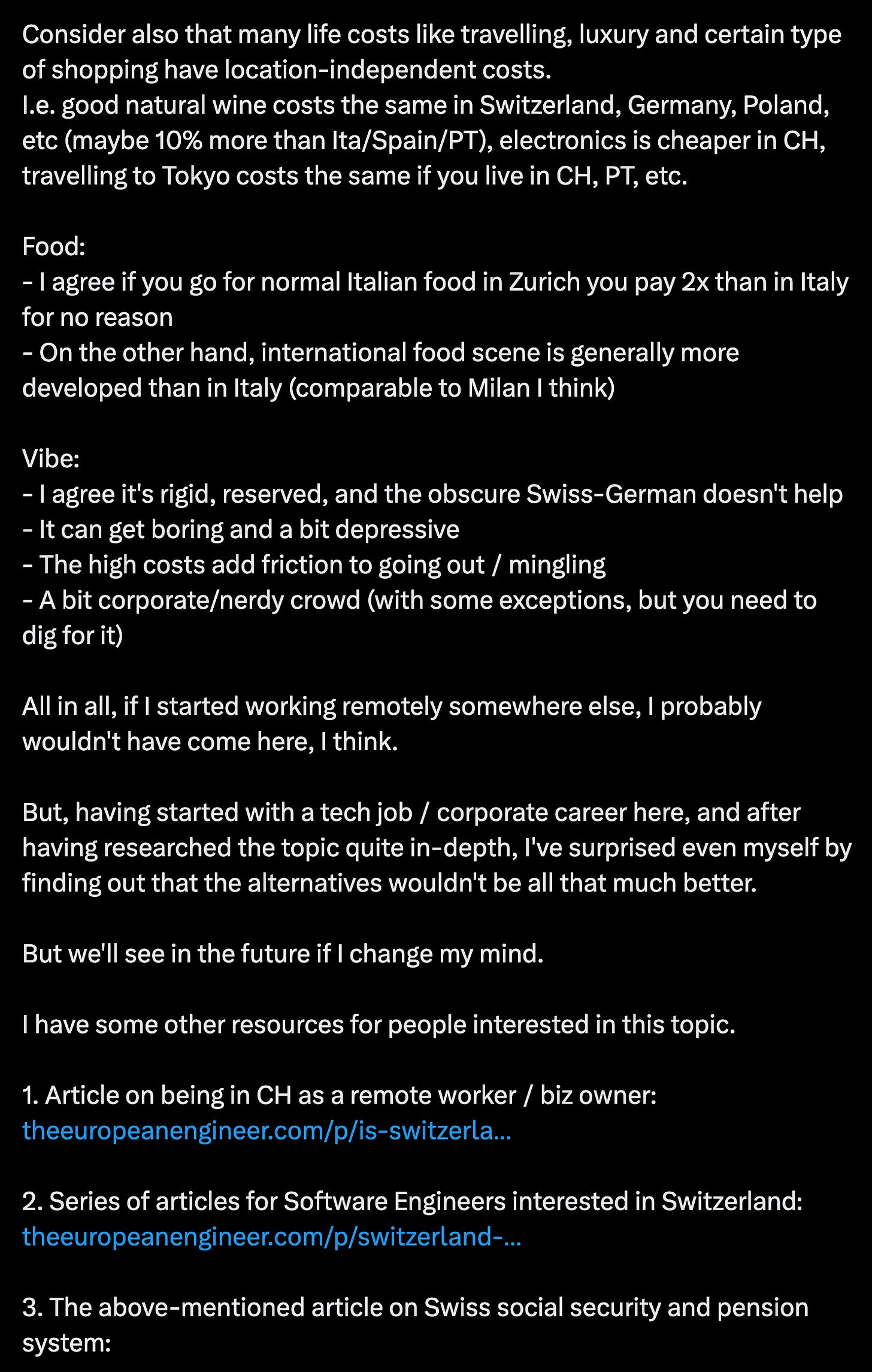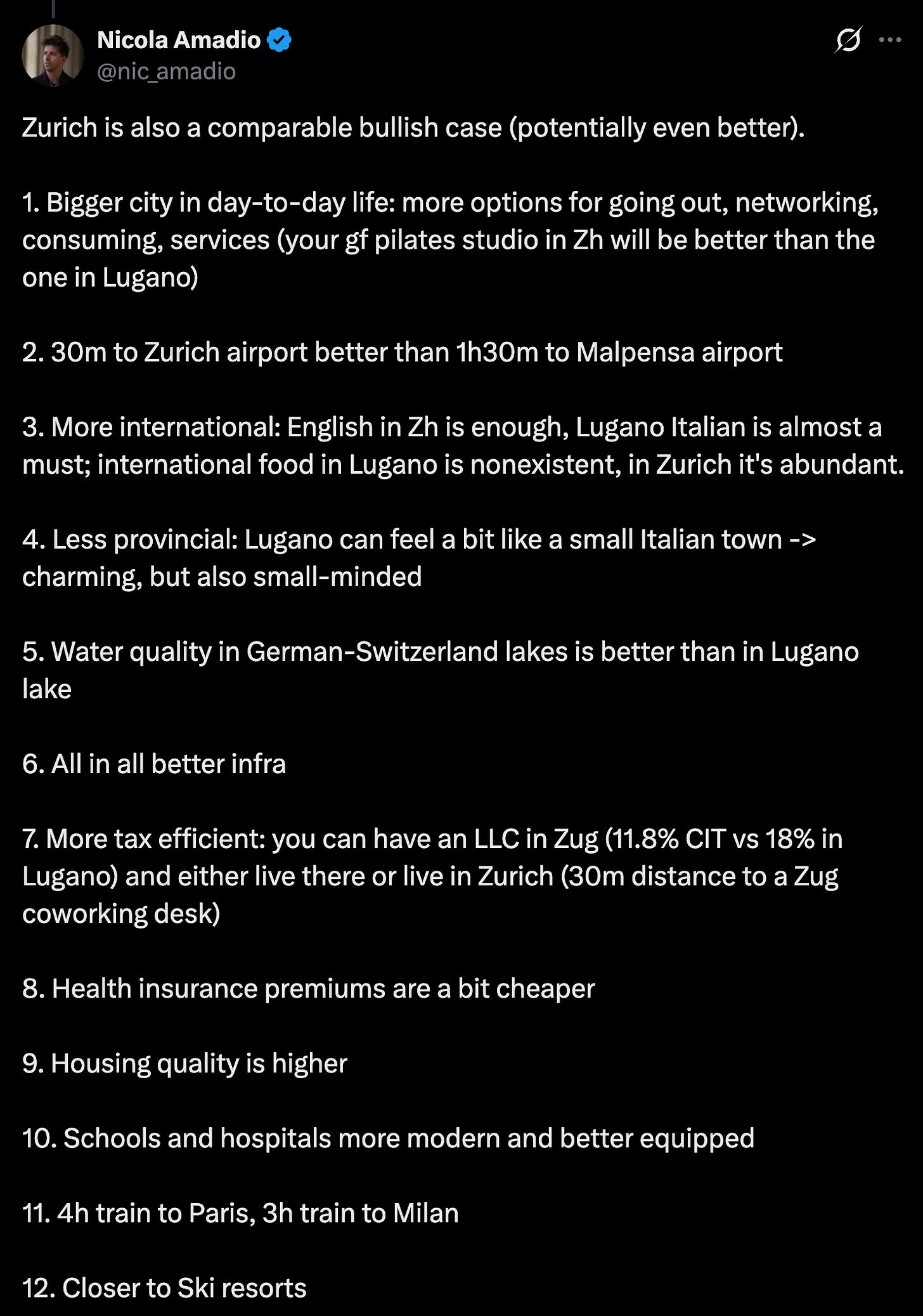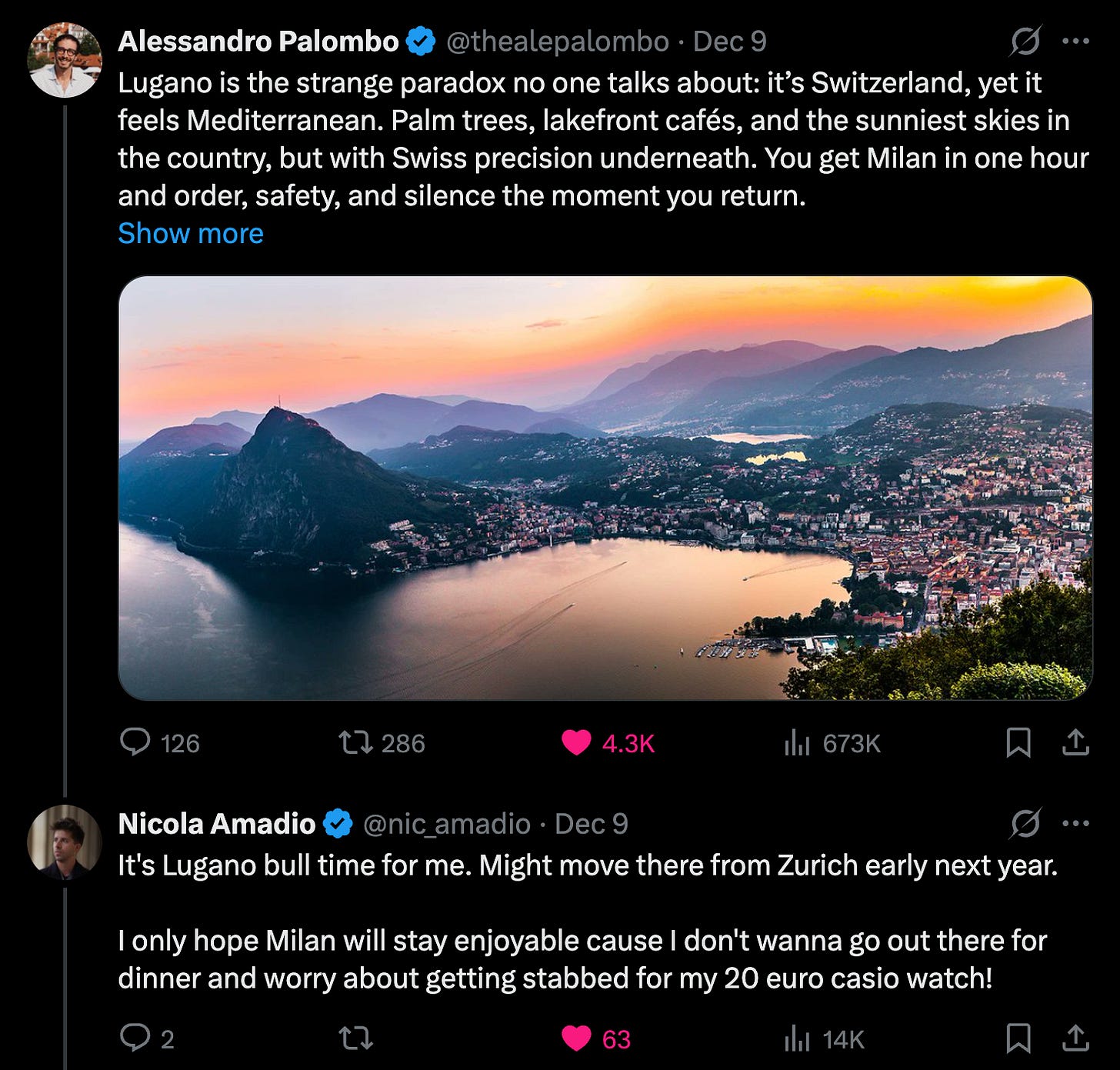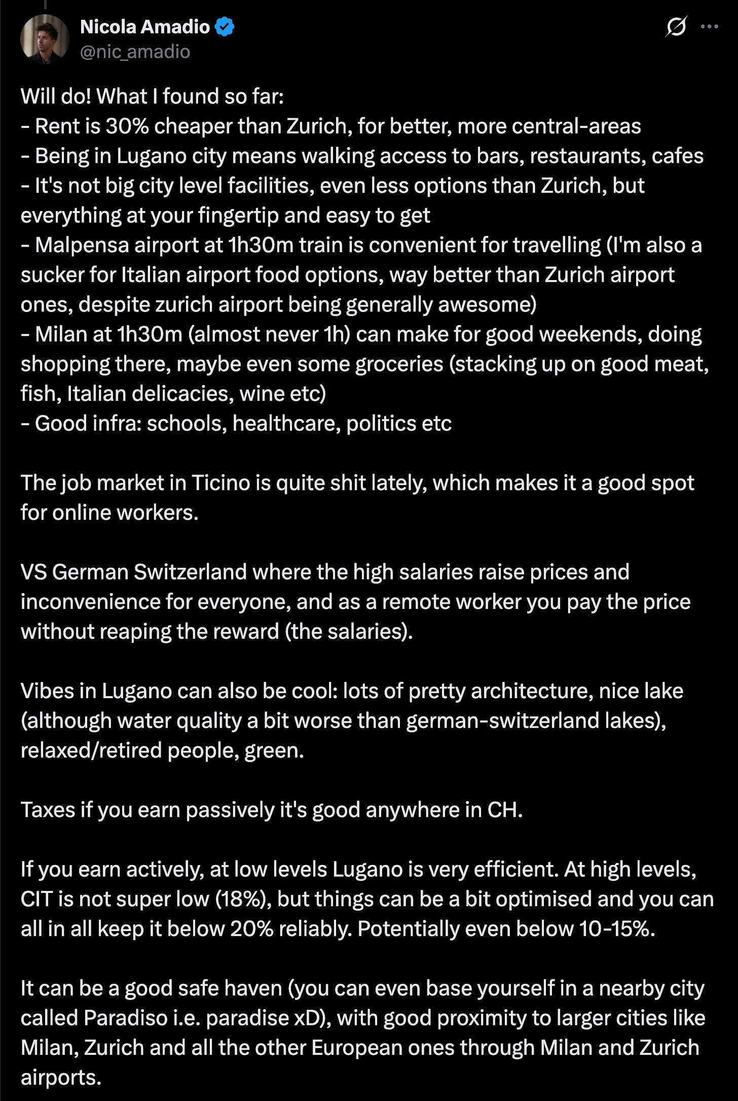 He said the main reason was bigger city for day-to-day life. He’s a Milan native and said that he’s not that enticed by Milan nowadays, and since his (also remote) gf joined him in Lugano, he kinda stopped going to Milan over the weekends.