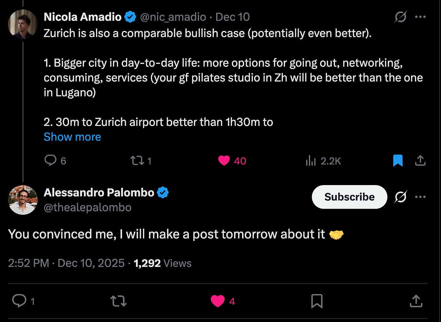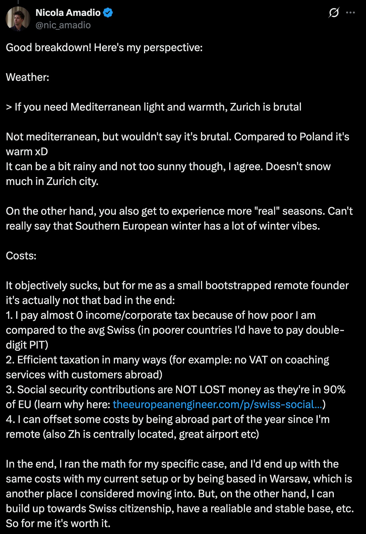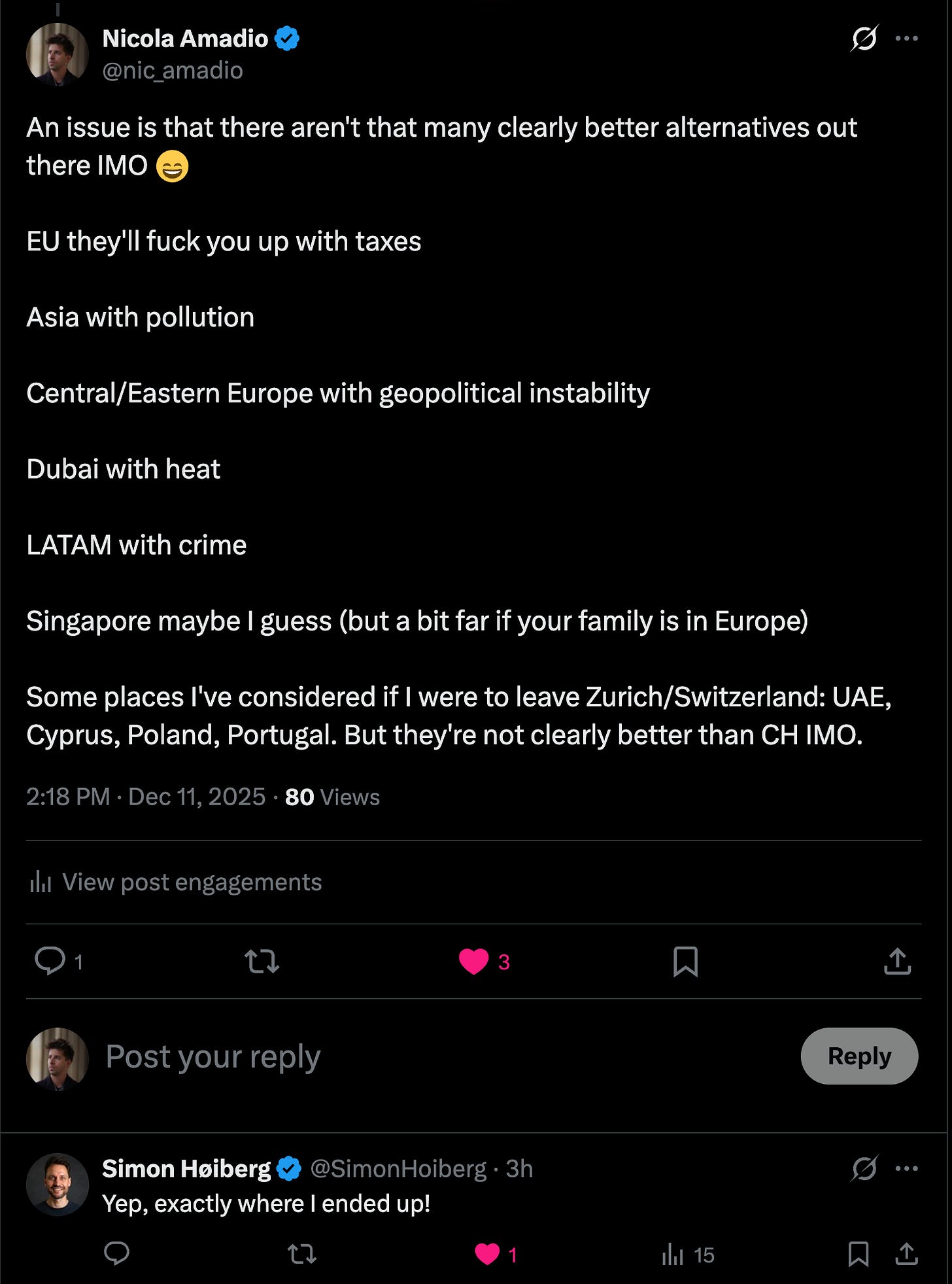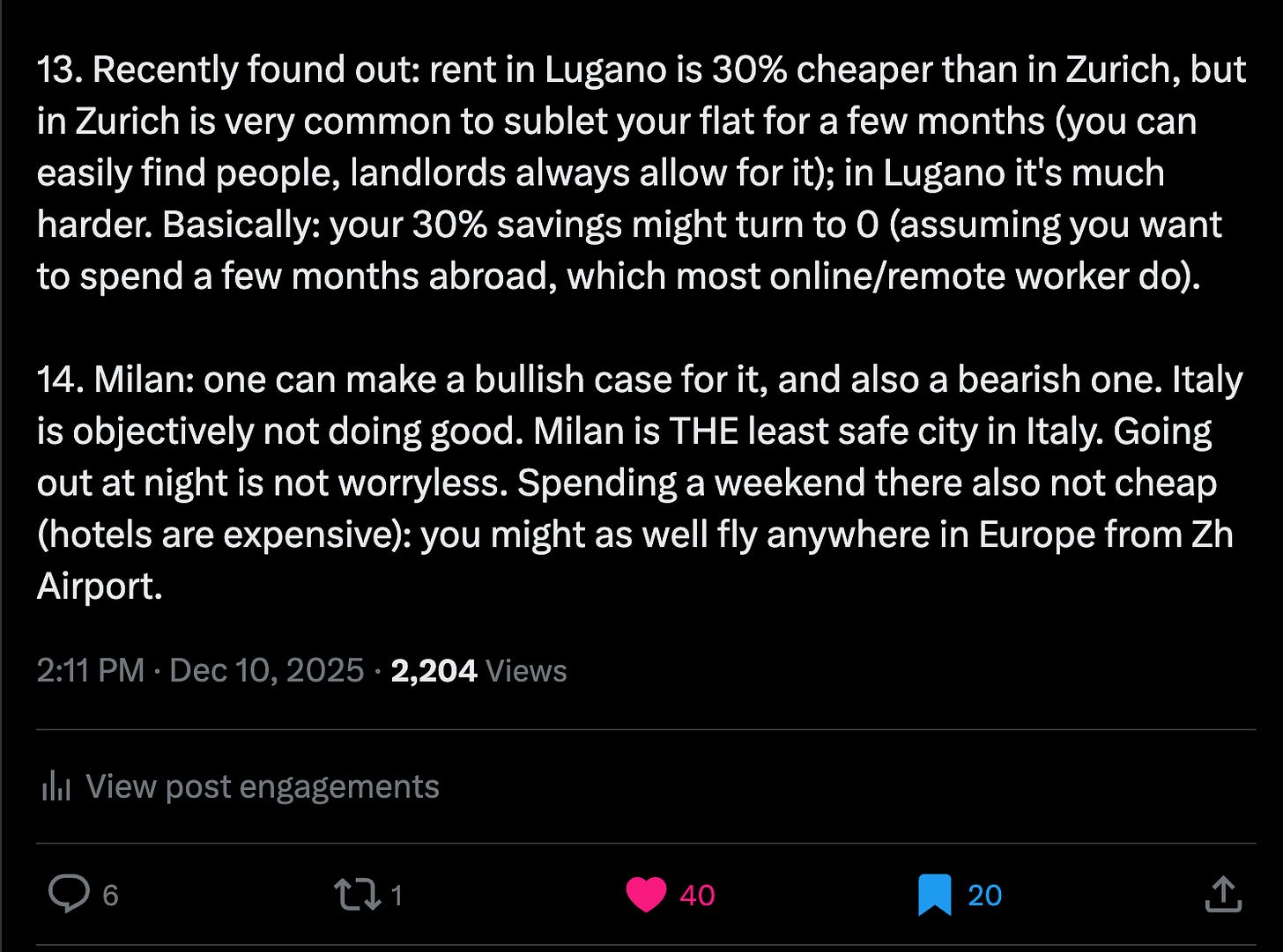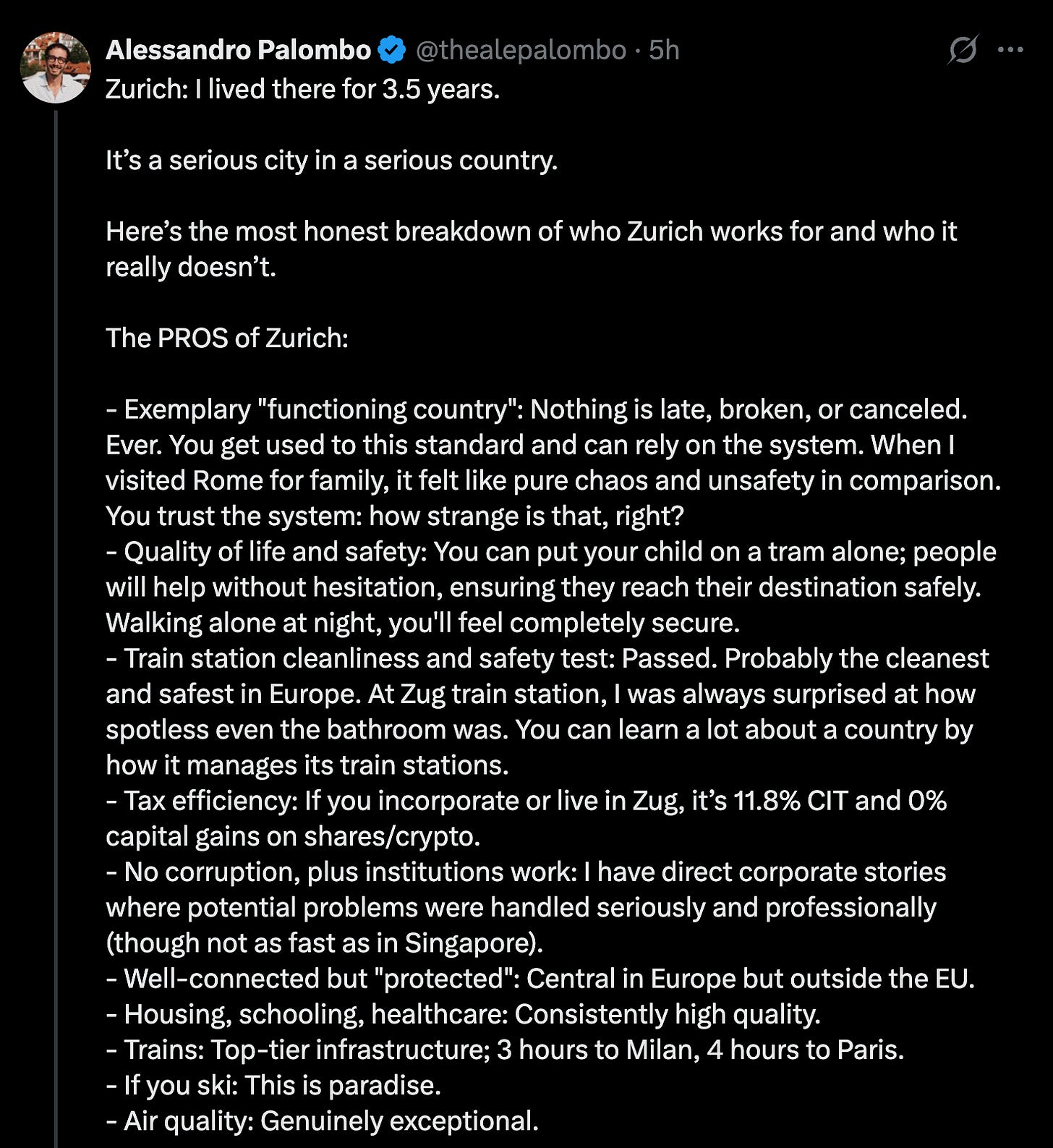 For this comparison, I’ll collect some comments I dropped on Alessandro Palombo X posts on Switzerland these past few days (if you aren’t following me on X, here’s my profile).