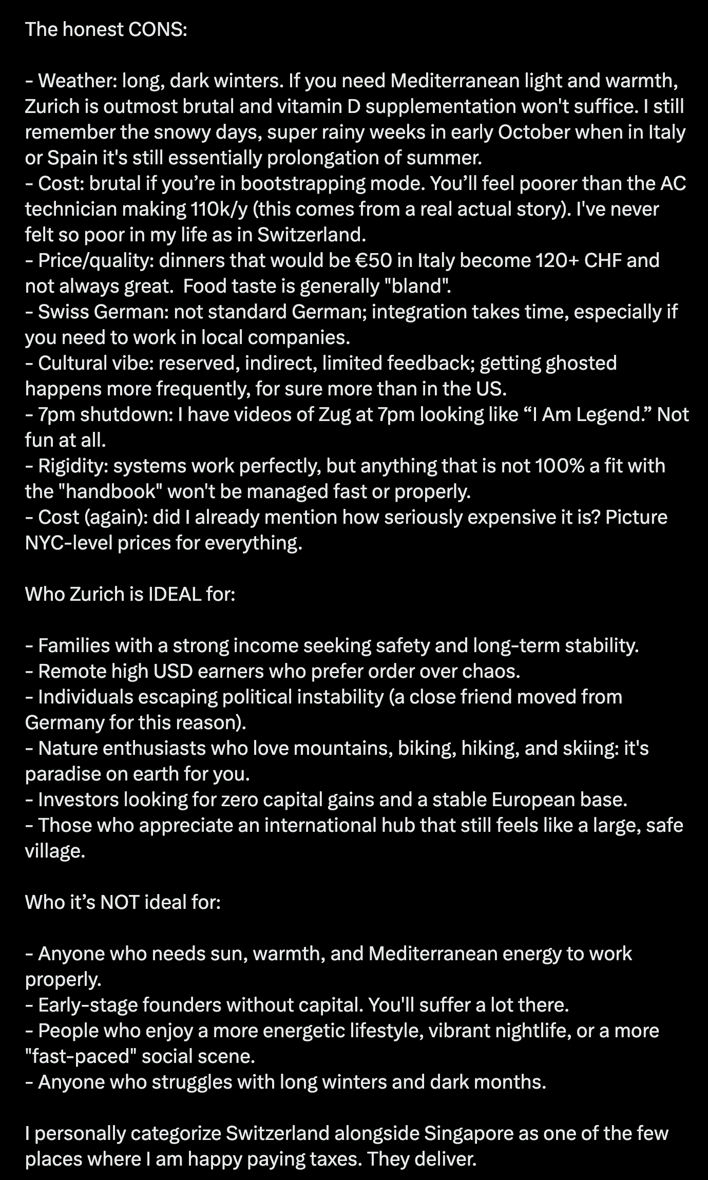 His post is a very balanced and IMO mostly accurate perspective on Zurich