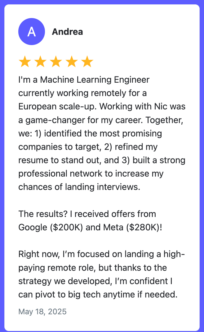 Work 1:1 with me (Nicola Amadio, author of this newsletter), and join the other engineers who were able to 2x/3x they pay and freedom in the past few months!