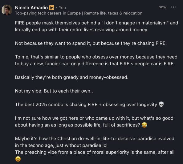 FIRE people mask themselves behind a "I don't engage in materialism" and literally end up with their entire lives revolving around money.