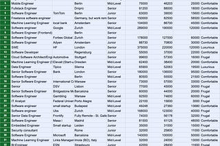 Crowdsourced data on before and after tax salaries and saving rates for devs in Europe.